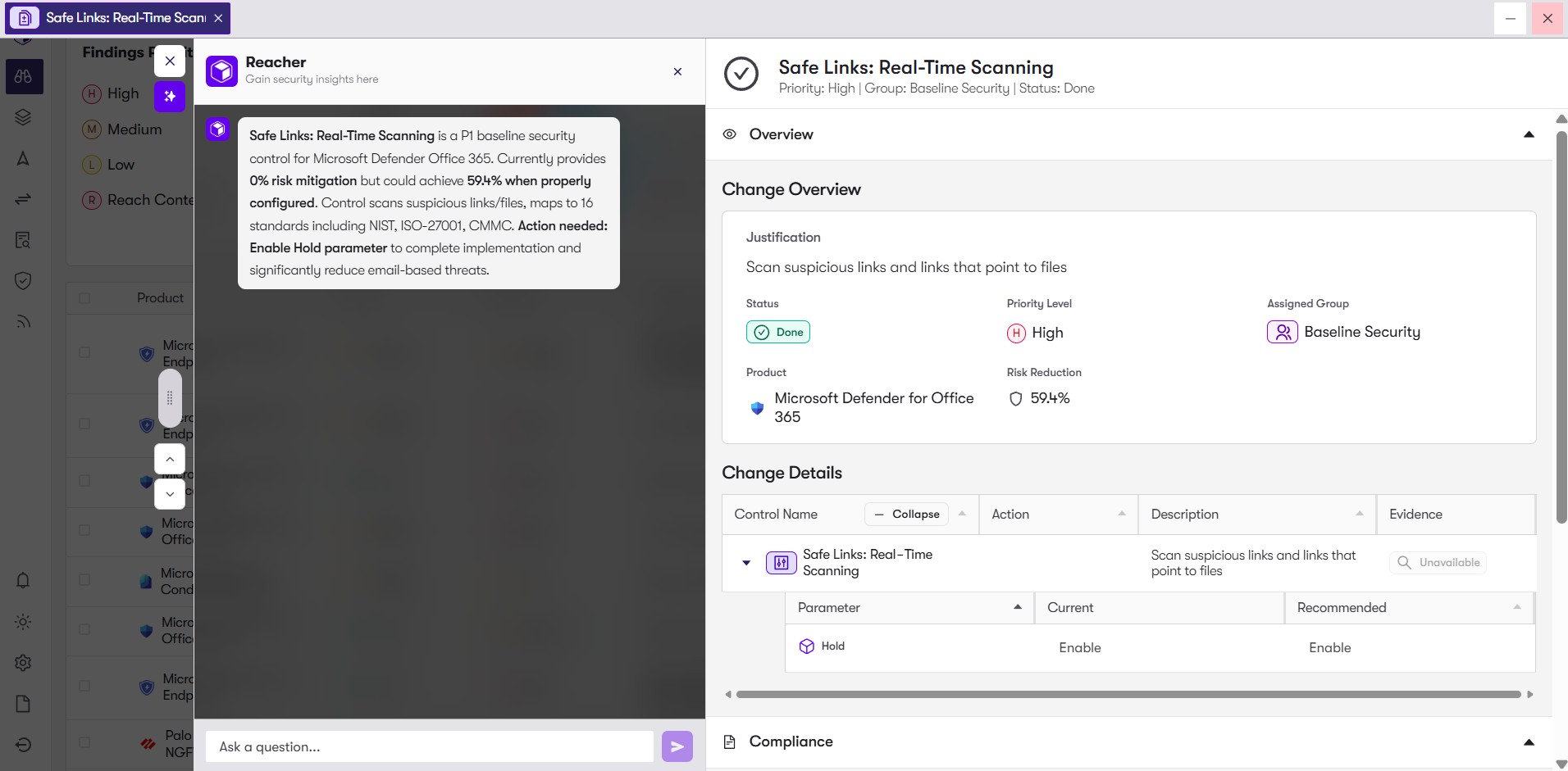 - Reach audits your email security configuration, verifying whether Safe Links / URL protection is enabled for inbound (and internal) mail.