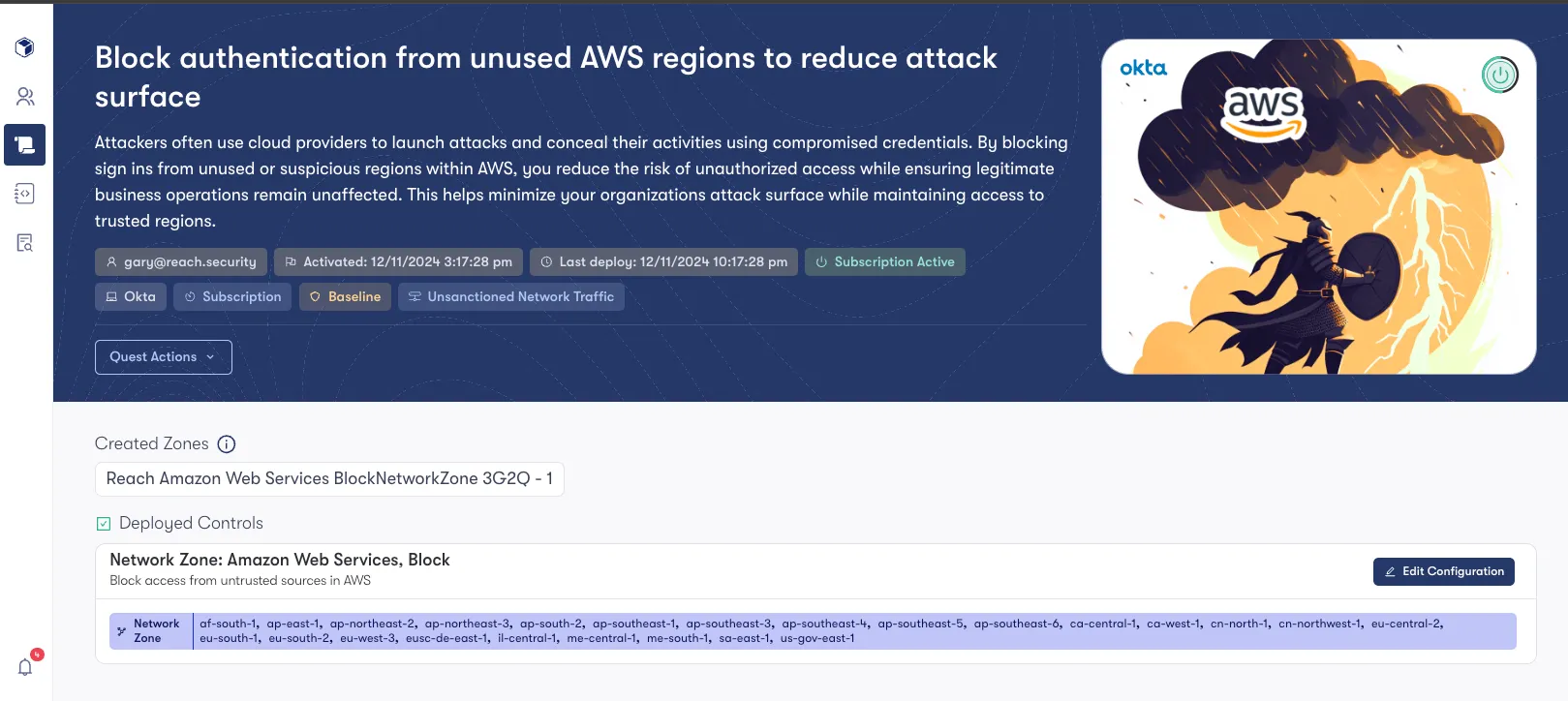 Next, within this Quest, we can view the details of the Network Zone that will be created and blocked within Okta. Notably, Reach has identified AWS authentication requests from within North America as normal behavior, so they are excluded from this configuration. Only regions outside North America are included. However, during the initial deployment, the configuration can be easily adjusted by selecting “Edit Configuration” to add or remove any AWS regions as needed.