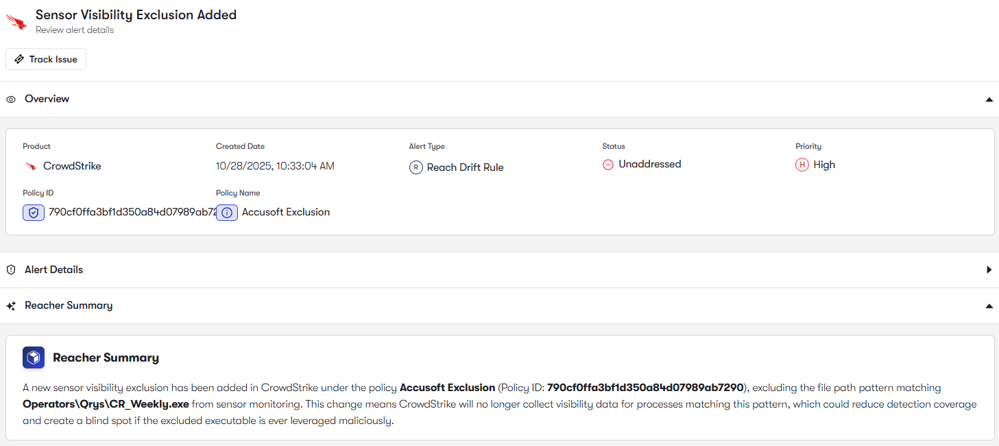 Falcon relies heavily on Indicators of Attack (IOAs) and behavioral analytics to detect attacker techniques such as credential theft, lateral movement, and script-based attacks. Reach analyzes detection configurations and policy settings to identify and remediate disabled behavioral protections or detection gaps across endpoint groups. This helps Falcon detect advanced attacks that traditional signature-based tools would miss.