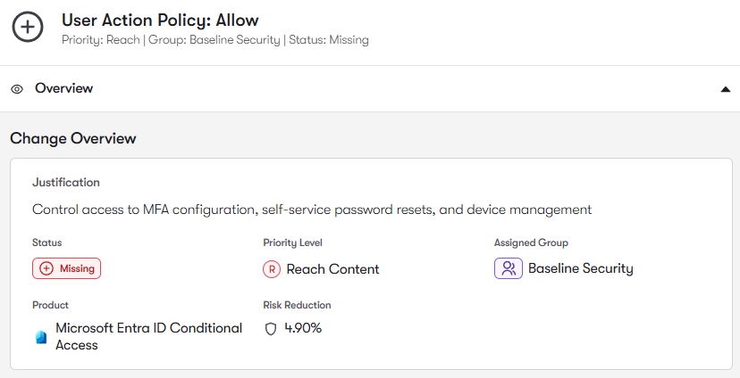Entra ID provides sign-in risk and user risk policies that respond to suspicious authentication activity. Reach analyzes these risk-based policies to identify environments where automated risk responses are not fully configured or enforced. It highlights opportunities to require stronger authentication or block high-risk sign-ins. In doing this, Reach helps organizations automatically respond to compromised accounts and suspicious login activity.