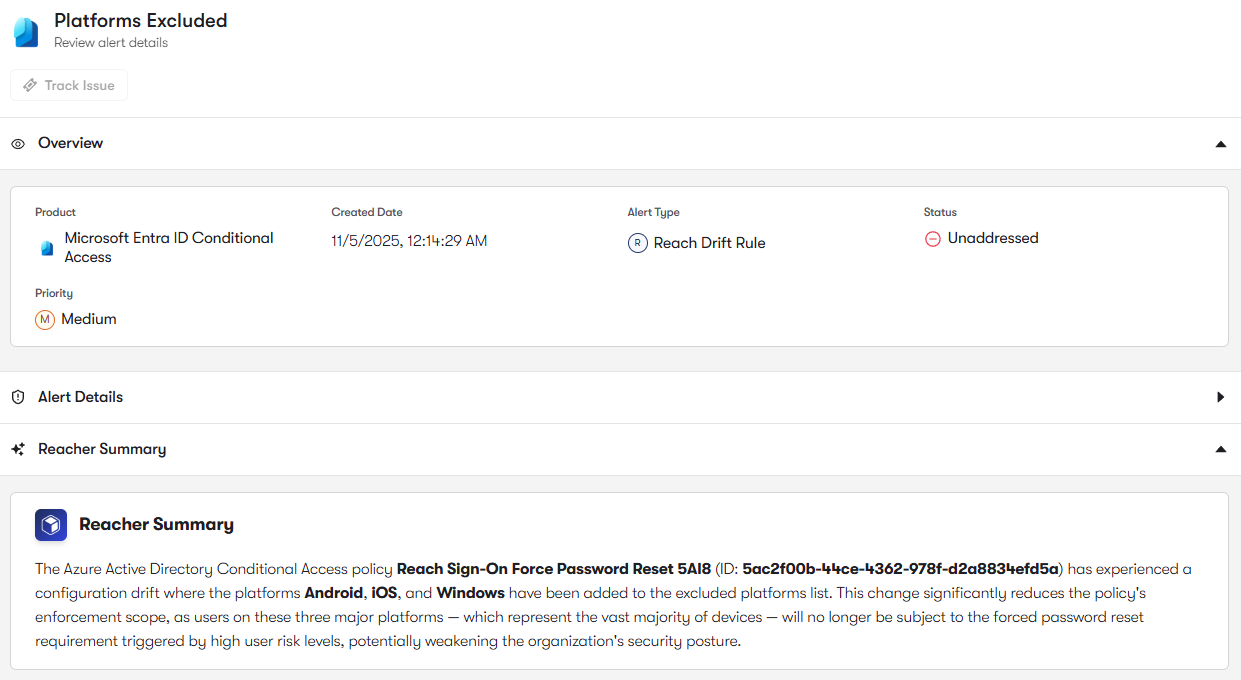 Conditional Access policies often contain exclusions, exceptions, or named location allowances designed to maintain usability. Over time, these exclusions can create unintended authentication bypass paths. Reach analyzes policy logic, exclusions, and rule precedence to identify scenarios where security policies are unintentionally bypassed. Reach tightens these policy conditions to ensure attackers cannot exploit gaps in identity protection.