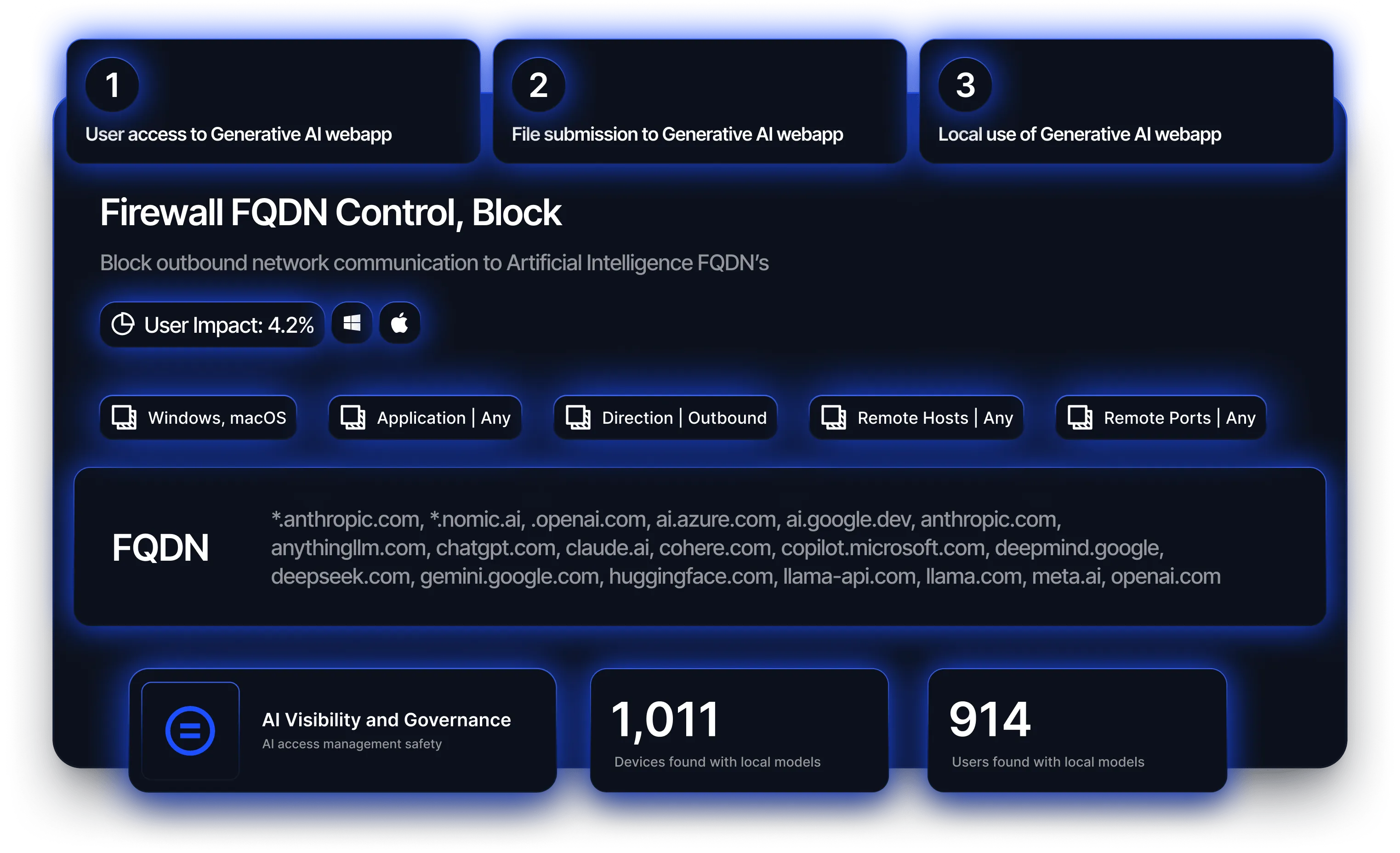 Reach delivers immediate coverage with no new deployments leveraging your existing security stack to surface usage, enforce policies, and close AI risk gaps across the enterprise.